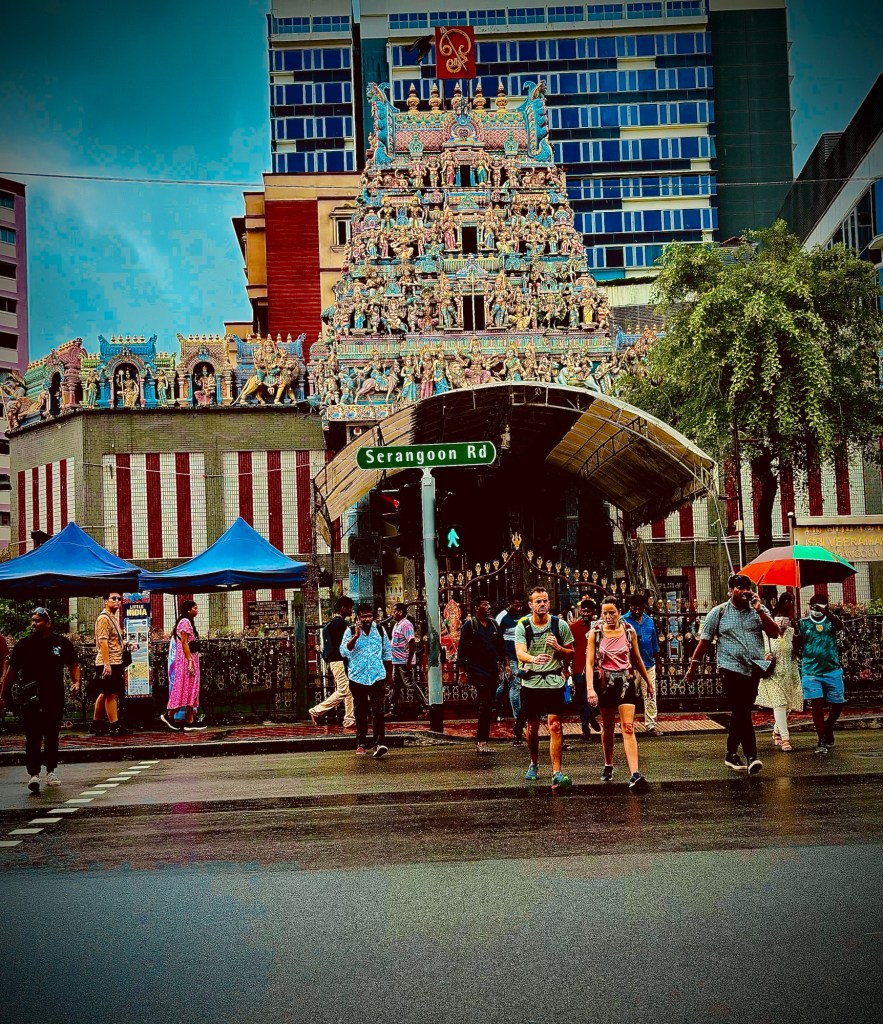 Ogni posto camminando lascia dietro di sé un odore ed un suono che si mescolano fondendosi in una musica che personalmente non avevo mai sentito. Che affascina. Tra gli Street food ed i banchi di frutta, tra i piccoli negozietti di ogni genere ed i magazzini degli artigiani, uno accanto all’altro sui marciapiedi e sotto i portici dove questi si dispiegano, diverse “razze” di cultura e religione che siamo soliti vedere in conflitto vivono invece in comunione e pace. Ad ogni passo l’odore forte di incenso si propaga nell’aria invadendomi fino al centro dell’anima e facendomi sentire parte di quel quadro, come se tutto fosse sempre stato così dentro di me mentre mi faccio largo nella gara di fumi ed aromi per chi riesce a sovrastare l’altro. E ancora, piccoli stand con collane di fiori da portare in omaggio ai guru e ai Dei venerati, presso i templi ad essi dedicati o agli angoli di strada, nei ricettacoli che fanno da punto di preghiera tra anziani che giocano a dama e bambini sull’altalena. E poi quelli di cianfrusaglie della cultura cinese o dei sarti indiani. È davvero tutto caratteristico ed affascinante. Sembra davvero tutto in contrasto. Un contrasto piacevole.