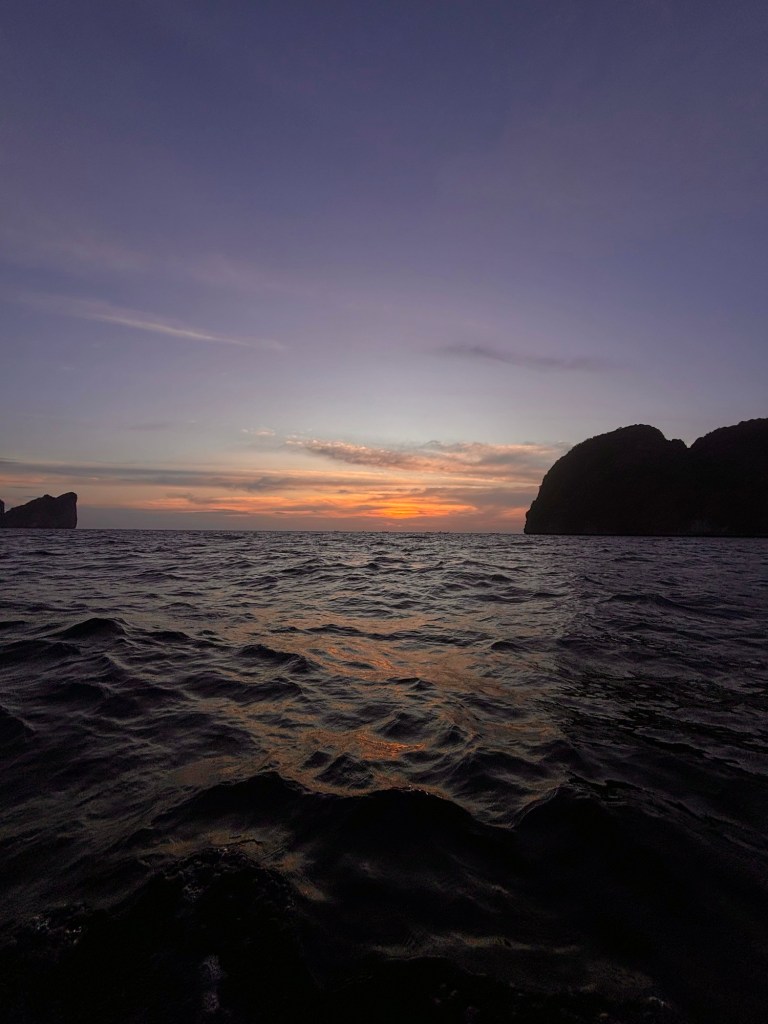 Chiedo perdono per loro a madre terra mentre navigo tra le isole e i parchi che circondano Koh Phi Phi Don. Il mare è mosso mentre la luna piena compare sembrando una lampadina dimenticata accesa di giorno. Sul lato opposto a lei il sole caldo comincia ad abbassarsi dietro le grandi coste granitiche ricoperte di alberi a fargli da cappello, forse li è ancora tutto intatto.